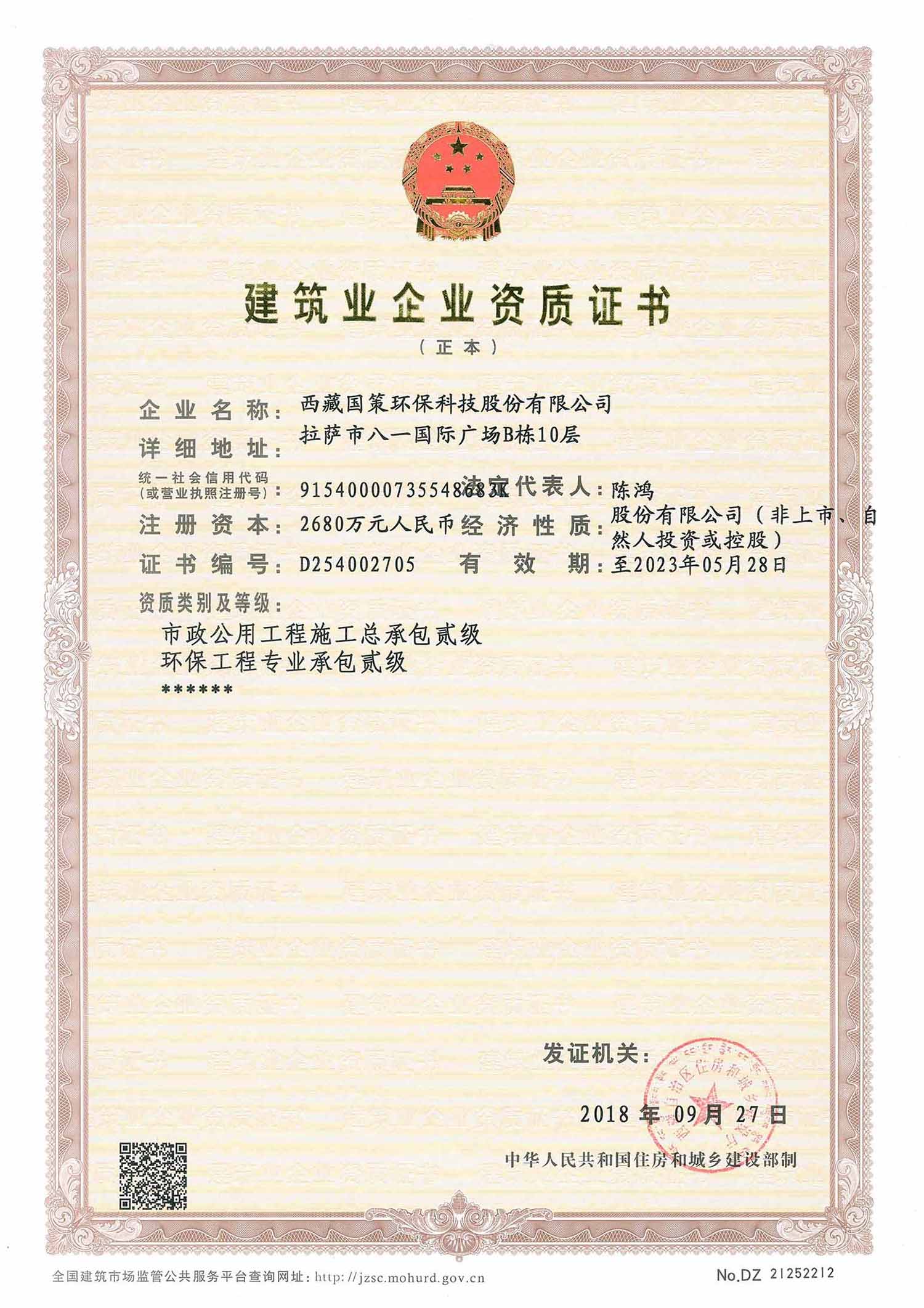 國策環(huán)保擁有住房和城鄉(xiāng)建設(shè)部頒發(fā)的建筑業(yè)企業(yè)市政公用工程施工總承包貳級資質(zhì)、環(huán)保工程專業(yè)承包貳級資質(zhì),同時擁有環(huán)保、市政、機(jī)電等各類專業(yè)工程技術(shù)人員共計(jì)40余人,并先后承擔(dān)了眾多污水廠、垃圾填埋場、自來水廠、醫(yī)療廢物處置中心等項(xiàng)目的施工任務(wù)。
