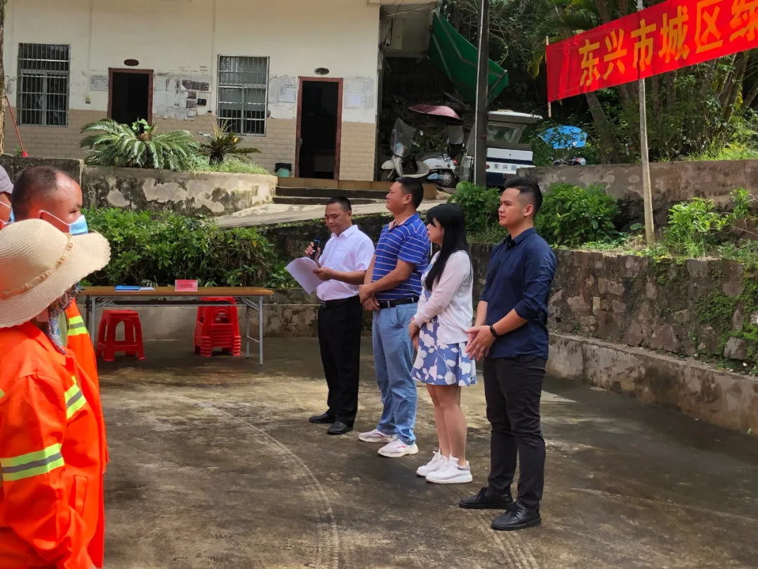 圖從左至右分別為:東興市園林處主任黃俊曄、東興市城市管理監(jiān)督局副局長尚顯華、東興市城市管理監(jiān)督局副局長黃曉璇、東興國策環(huán)??偨?jīng)理劉桂文